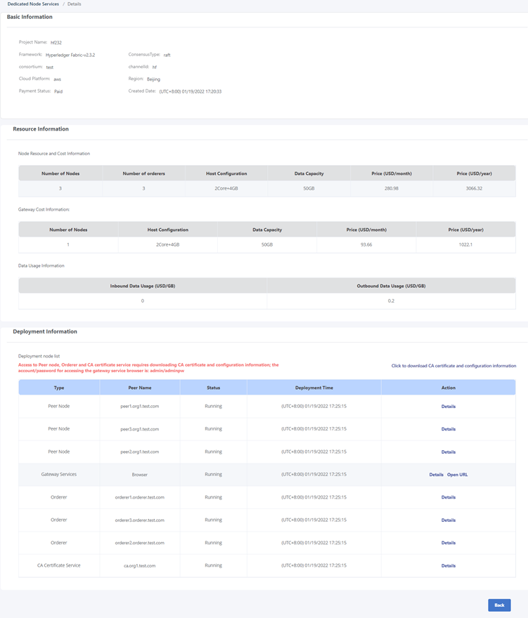 3) Deployment Information: Click on the "Click to download CA certificate information" button to download the certificate. Clicking on the "Details" button corresponding to the peer node, developer can view the information of Access and Credentials, Transaction Manager cluster, and Default Wallet.